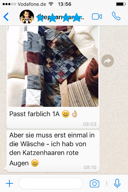 Tja, so eine Patchworkdecke lässt sich nicht nähen ohne, dass die heimischen Katzen mitmischen, drüberlaufen und probeschlafen. Da hat es ein Tierhaaralergiker etwas schwer.